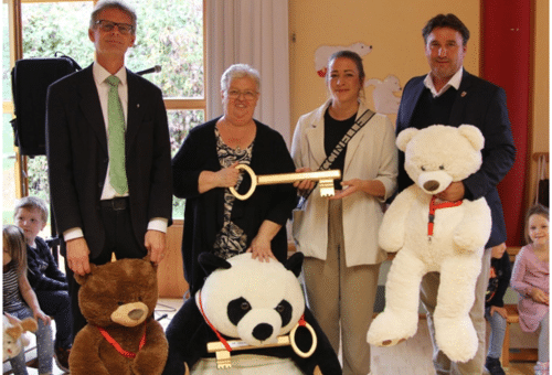 Nach der Fertigstellung der großzügigen Außenanlagen im Kindergarten Arche Noah in Steppach konnten wir nun Anfang Oktober im Rahmen eines Tags der offenen Tür auch symbolisch den Schlüssel für die Erweiterung um eine dritte Gruppe (Pandabären) übergeben.